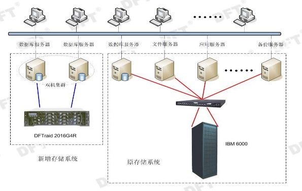 新增服務(wù)器安裝IBM AIX小機系統,兩臺服務(wù)器通過(guò)雙機軟件搭建成雙機熱備系統,通過(guò)在兩臺服務(wù)器中安裝SCSI HBA卡,通過(guò)SCSI線(xiàn)直接與DFTraid 2016G4R直接相連形成DAS的存儲架構,DFTraid 2016G4R滿(mǎn)配16塊1TB SATA硬盤(pán),其中8塊盤(pán)配置成RAID5+Spare用于新增服務(wù)器雙機系統的數據庫數據存儲,另外8塊盤(pán)配置成RAID5+Spare用于LAN網(wǎng)絡(luò )中文件服務(wù)器的數據存儲。