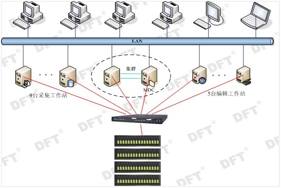 根據需求共9臺采集工作站,兩臺MDC服務(wù)器,5臺編輯工作站,在線(xiàn)存儲容量為17TB。為滿(mǎn)足客戶(hù)高帶寬、高可靠性和高性能的要求,我們采用DFT GS 3992T這款高性能的4Gb產(chǎn)品,為用戶(hù)提供16Gb的系統帶寬。通過(guò)SANergy共享系統軟件,為所有的工作站提供大容量的存儲空間,并保證了持續的高速數據讀寫(xiě)傳輸。