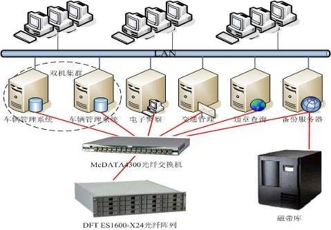 車(chē)輛管理系統使用兩臺IBM小型機,為了保證系統更為可靠持續運行,系統采用雙機集群,數據存儲到DFT磁盤(pán)光纖陣列中。