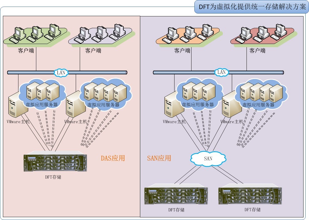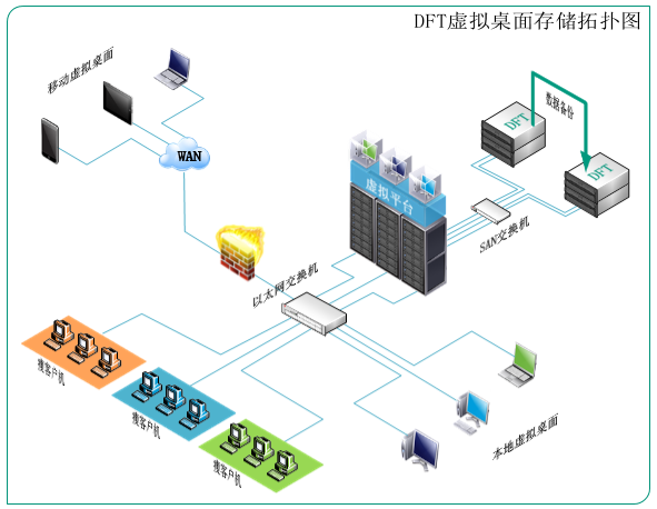2、DFT存儲與通過(guò)光纖交換機與虛擬服務(wù)器連接,提供多臺虛擬桌面所需要性能和容量;