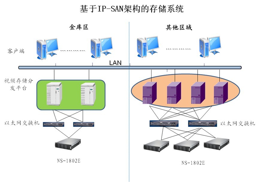 視頻監控應用對與存儲設備要求具備高帶寬、大容量的要求,因此在此項目中,DFT向中行推薦了高性?xún)r(jià)比的NS 1802E存儲產(chǎn)品,該產(chǎn)品對外提供4個(gè)1Gb iSCSI主機接口,同時(shí)可以擴展到112塊硬盤(pán),單套存儲系統224T的容量。