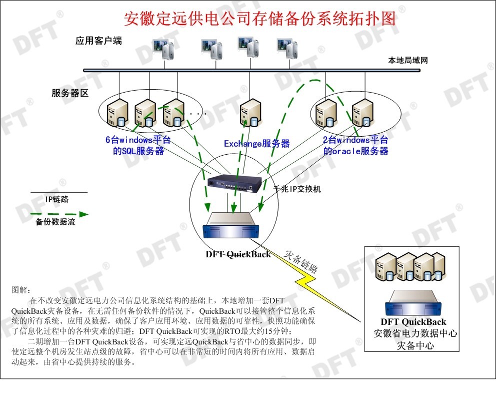 在不改變安徽定遠電力公司信息化系統結構的基礎上,本地增加一套DFT QuickBack災備設備,在無(wú)需購買(mǎi)額外備份軟件的情況下,QuickBack可以為整個(gè)信息化系統的所有系統、應用及數據提供全方位的災難備份恢復,確保了客戶(hù)應用環(huán)境、應用數據的可靠性,快照功能確保了信息化過(guò)程中的各種災難的歸避;DFT QuickBack可實(shí)現的RTO******不超過(guò)15分鐘;